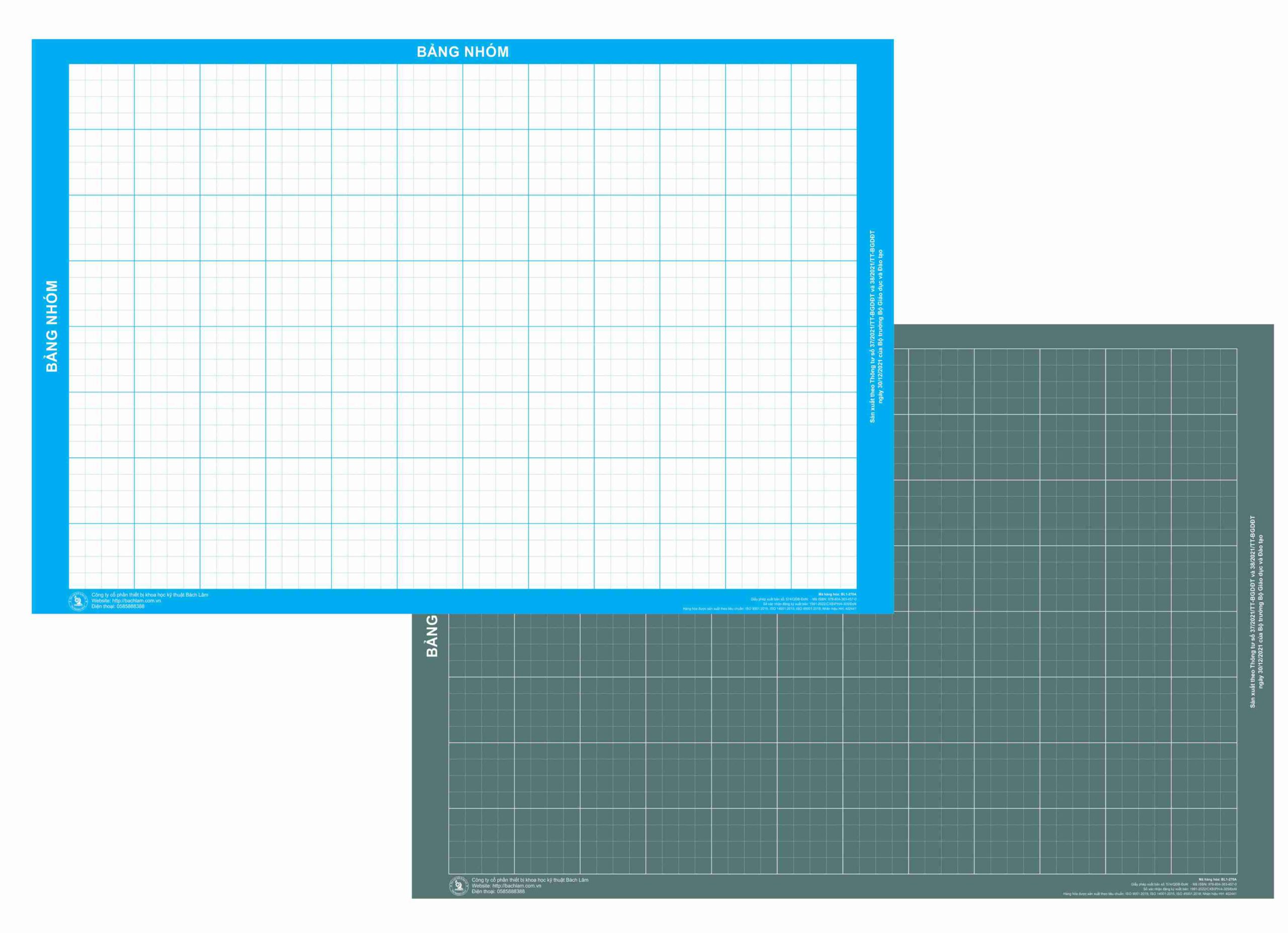 | Kích thước (400x600x0,5)mm, một mặt mầu trắng kẻ ô li dùng để viết bút dạ xoá được; một mặt màu xanh, dòng kẻ ô li trắng dùng để viết phấn. |