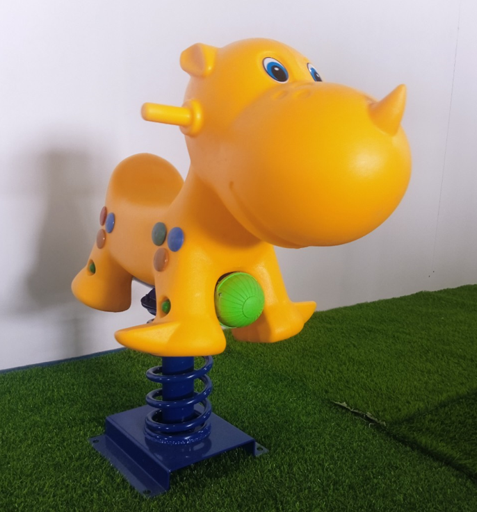 KT: Dài 0.7m, Rộng 0.4m, Cao 0.93m. Con giống bằng nhựa LDPE đúc liền khối. Đế bằng sắt tấm dày 5mm, lò xo Ø160mm cao 250mm, dây lò xo Ø18mm, tất cả được sơn sần tĩnh điện ngoài trời. Chiều cao từ mặt đất lên chỗ ngồi là 53cm. Kt chỗ ngồi là 20*20cm.